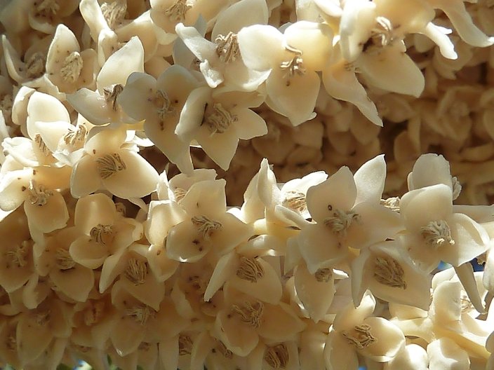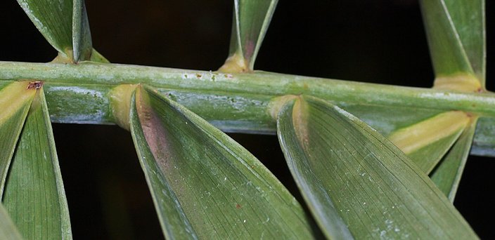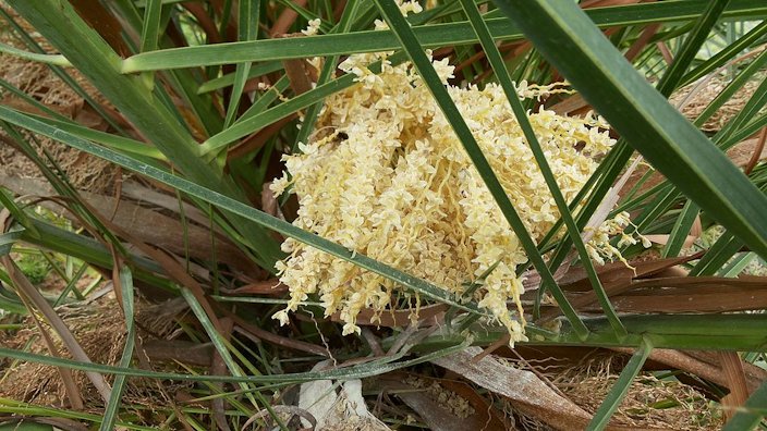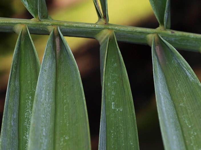Fig. 6. View of leaflet and waxy bloom Fig. 7. P. dactylifera leaflet attachment Fig. 8. Closer view of leaflet and waxy bloom Root system The lack of roots in the top soil allows other cultures such as wheat, lucerne and vegetables to be inter-cropped. While, the high concentration and deep presence of primary roots allows the date palm to benefit from underground moisture and consequently, unlike most fruit palms, resist water stress and drought conditions. 8 Flowers Dates are formed from flowers on 4 ft (1.2 m) inflorescences that emerge from among the leaves in spring. Inflorescence is produced in the axil of a 1-year-old leaf. Male and female flowers grow on separate plants. Only female plants produce dates and only if a male tree is nearby. 1,14 Small fragrant flowers (the female whitish, the male waxy and cream colored), are borne on a branched spadix divided into 25 to 150 strands 12 to 30 in (30-75 cm) long on female plants, only 6 to 9 in (15-22.5 cm) long on male plants. The spadix is enclosed in a tough spathe that bursts open when the flowers are mature. One large inflorescence may embrace 6,000 to 10,000 flowers. Some date palms have strands bearing both male and female flowers; others may have perfect flowers. As the fruits develop, the stalk holding the cluster may elongate 6 ft (1.8 m) while it bends over because of the weight. 3,14