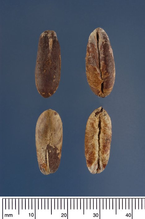 Fig. 32. Two fruits of the date palm, the left is a Medjool date, the right is a Khadrawi (or Hadrawi) date Harvesting In 4 or 5 years, the crown clears the ground and the 1st flowering can be expected. 14 Ordinarily, in palms 5 to 8 years old, the first crop will be 17.5 to 22 lbs (8-10 kg) per palm; at 13 years, 132 to 176 lbs (60-80 kg). Some improved cultivars, at high densities, have yielded over 220 lbs (100 kg) per year. 3 Whole dates are harvested and marketed at three stages of their development (Khalal, Rutab and Tamar) depending on variety, climatic conditions and market demand. 9 Propagation Date palms grow readily from seeds if the seeds and seedlings are kept constantly wet. But seedlings are variable and take 6 to 10 years to fruit. Furthermore, 50% of the seedlings may turn out to be males. Propagation is usually done by trunk suckers, which may be carefully removed from the mother tree. After the fourth or fifth year of a palm's life, the owner can usually take at least two offshoots a year from it for a period of ten years. 17 Propagation from seed is done when there are no mature mother trees in the locality; this poses no particular problems but takes longer. The seeds are sown in containers and the young seedlings grown in the nursery for about 1 year before planting out in the field. 14 It is important that male trees are planted with females in ratios of about 1:50. Suckers from quality trees are in high demand for their guaranteed quality. 14