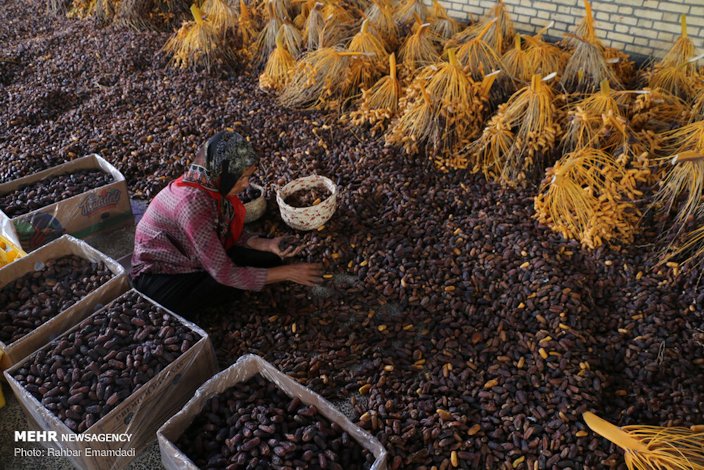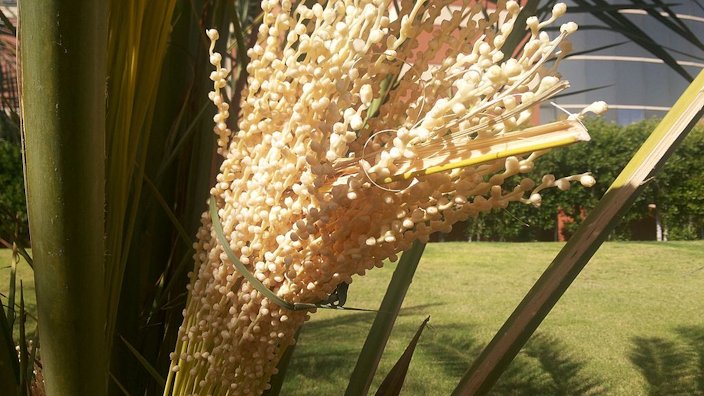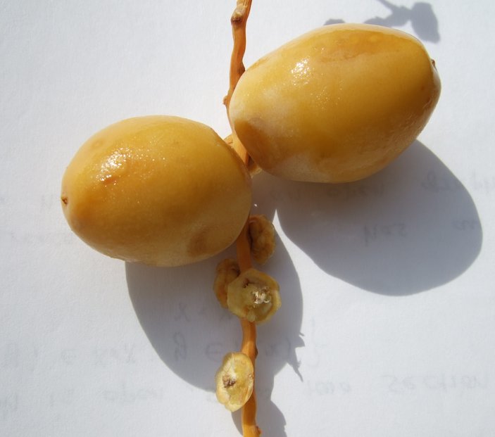 Fig. 14. A blooming male date palm inflorescence and its pollen Fig. 15. Female date palm inflorescence at Ajman University of Science and Technology, Ajman, UAE Fig. 16. Female date inflorescence Fig. 17. Flores hembra, La Huerta, Albatera, Alicante, España (female flowers) Fig. 18. P. dactylifera: flores macho, La Huerta, Albatera, Alicante, España (male flowers) Pollination Fruit production requires that both female and male trees be present in the same area. Date palm is highly cross pollinated due to its dioecious nature. In commercial plantation, mechanical or hand pollination is done. For this, 2-3 male trees are enough to pollinate 100 female palms. About 2-3 strands of male flowers are inserted between the strands of female flowers. If the male spathes open earlier than female, the pollen is dried and stored for use at a later date. 7 In India, spathes generally emerge during February-March and the flower opening starts during March-April. Although stigma of female flower remains receptive for several days, it is better to pollinate the inflorescence as soon as they crack open. 7 Fruit The fruit is oblong, 1 to 3 in (2.5-7.5 cm) long, dark-brown, reddish, or yellowish-brown when ripe with thin or thickish skin, thick, sweet flesh (astringent until fully ripe) and a single, cylindrical, slender, very hard stone grooved down one side. 3 Dates are not formed in climates that are too cool. When grown in humid tropical climates like Florida, the fruit tends to be of low quality often dropping from the tree before ripening. 1 Dates go through 4 stages of development (Fig. 31): 1) Chimri, or Kimri, stage, the first 17 weeks after pollination: green, hard, bitter, 80% moisture, 50% sugars (glucose and fructose) by dry weight; 2) Khalal stage, the next 6 weeks: become full grown, still hard; color changes to yellow, orange or red, sugars increase, become largely sucrose; 3 ) Rutab stage, the next 4 weeks: half-ripe; soften, turn light brown; some sucrose reverts to reducing sugar which gains prominence; 4) Tamar stage: ripe; the last 2 weeks; in soft dates, the sugar becomes mostly reducing sugar; semi-dry and dry dates will have nearly 50% each of sucrose and reducing sugars. 3