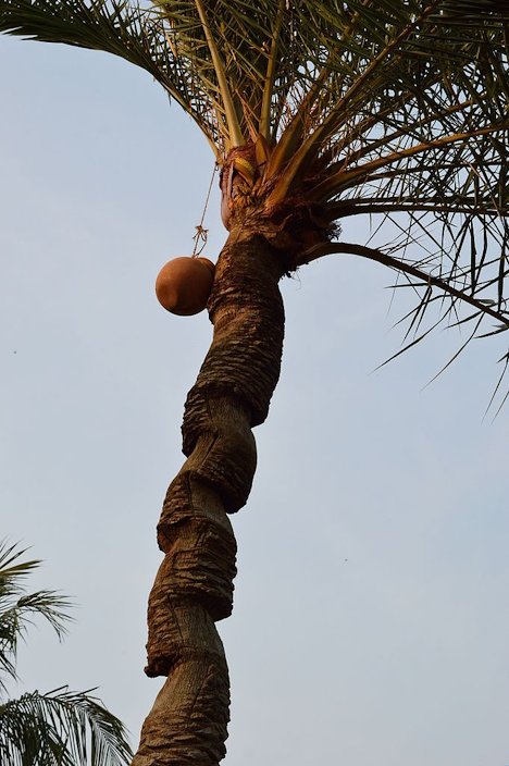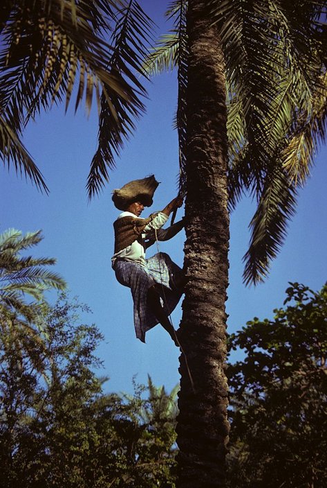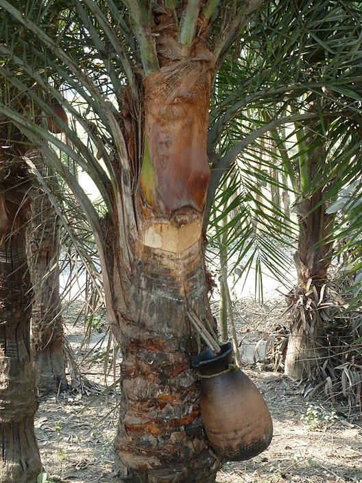 Fig. 57. The sweet sap is tapped from date palm tree in Nadia district, West Bengal, India; Jaggery is made from this sweet sap Fig. 58. Taki, West Bengal, note the shape of the tree after many sap tappings Fig. 59. Shack made of date branches at Neot Semadar, Israel Fig. 60. Arrack, Extra special, 40%, Ratgama Hegoda, Southern, Sri Lanka Date Products and Preparations, Food and Agriculture of the United Nations General In Italy, there are some groves of date palms maintained solely to supply the young leaves for religious use on Palm Sunday. In Spain, only the leaves of male palms are utilized for this purpose. 3 In North Africa, they are commonly used for making huts. Mature leaves are also made into mats, screens, baskets and fans. Processed leaves can be used for insulating board. Dried leaf petioles are a source of cellulose pulp, used for walking sticks, brooms, fishing floats and fuel. Leaf sheaths are prized for their scent, and fibre from them is also used for rope, coarse cloth, and large hats. The leaves are also used as a lulav in the Jewish holiday of Sukkot. 13
