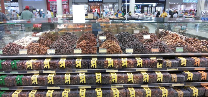 ![]() Fig. 1 ![]() Phoenix dactylifera, ripe fruit ![]() Fig. 2 ![]() ![]() Fig. 3 ![]() P. dactylifera leaf rachis and spines ![]() Fig. 4 ![]() Date palm spines close-up ![]() Fig. 5 ![]() P. dactylifera leaf bases and fibers ![]() Fig. 11 ![]() Male date palm inflorescence, and the whole thing with its cover is called (طَلْع singular form) in Arabic ![]() Fig. 12 ![]() The female Tamim and the male date flower (تميم) from the Dar al-Manasir region of Northern Sudan, near the Nile ![]() Fig. 13 ![]() Pollinated date palm female inflorescence (close-up), at Ajman University of Science and Technology ![]() Fig. 19 ![]() Immature date fruits, Medinet Habu, Theban Necropolis, Egypt ![]() Fig.20 ![]() Dates on a date palm in Las Vegas, Nevada ![]() Fig. 21 ![]() Specimen of P. dactylifera growing in Adu Dhabi with the infrutescence bagged to collect the ripening dates ![]() Fig. 33 ![]() Mature specimen of P.dactylifera growing in Morocco with fruit clusters (infructescences) hanging below the leaves ![]() Fig. 34 ![]() P. dactylifera field of young individuals in cultivation ![]() Fig. 38 ![]() P. dactylifera older individual with multiple stems ![]() Fig. 39 ![]() Date palm bark showing cut leafs and fibers ![]() Fig. 40 ![]() Fig. 41 ![]() Date picker, Saudi Arabia ![]() Fig. 42 ![]() Bunches of mature dates that have just been harvested in the Al Ain Oasis (UAE) in late summer ![]() Fig. 43 ![]() Growers harvesting Piarom date in Hormozga, southern Iran ![]() Fig. 44 ![]() An assortment of dates, Sydney, Australia ![]() Fig. 45 ![]() Sheer khurma (vermicelli milk dates pudding) ![]() Fig. 46 ![]() Dates stuffed with marzipan ![]() Fig. 56 ![]() Date seller in the old souq in Kuwait City, surrounded by dates from Kuwait, Iran, Saudi Arabia and elsewhere Back to Edible Palms |