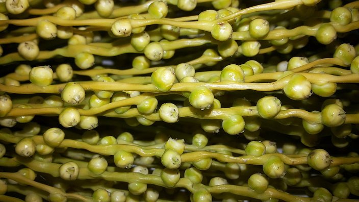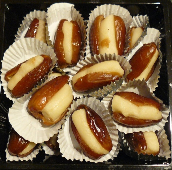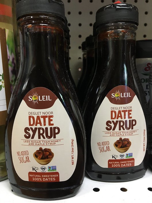 Fig. 47. Yellow dates, raw dates pickle Fig. 48. Fresh dates and apple crumble Fig. 49. Sticky date pudding with toffee and single malt scotch sauce Fig. 50. Chocolate-coated dates Fig. 51. Bacon-wrapped dates, Highlands Kitchen, Edmonton, AB, Canada Fig. 52. Pumpkin date shake, Las Vegas Fig. 53. Dates paste, product of Saudi Arabia Fig. 54. Vente de dattes à Dakar (Sénégal) à l'occasion du Ramadan Fig. 55. Date syrup, Chapel Hill, North Carolina, USA Medicinal Uses ** Each individual tree is either a male or a female (as is true for all species within this genus). Male trees are extremely allergenic because their pollen is air-borne, whereas the female palms cause minimal to no allergies. 2 The fruits are used to treat respiratory diseases and fevers. Gum obtained from the tree is used to treat diarrhea. 8 Other Uses Date palm makes an attractive landscape specimen with its blue-green leaves, textured trunk, and bright orange inflorescences. 2 The seeds (stones) when ground and softened by soaking in water are used for feeding camels, goats and horses and have successfully been substituted as a poultry feed. 14 Seed oil is used in soap making and in cosmetics. The leaves are used as thatching material (Fig. 59). It yields fiber which can be used to make ropes, baskets, hats, and mats. The wood is strong and resistant to termite attacks. It is used in construction and for fuel. 8 Wherever fruiting is poor, the sap is the main product. It can be drunk fresh, fermented and drunk as toddy, or distilled and drunk as arrack (Fig. . The yield of sap varies with management and site conditions, but it is in the range of 4-8 l/day (Fig. 57,58). 14 Being a halophytic species, P. dactylifera has been used for decades for the revegetation of salt affected lands in the Mediterranean region. 14