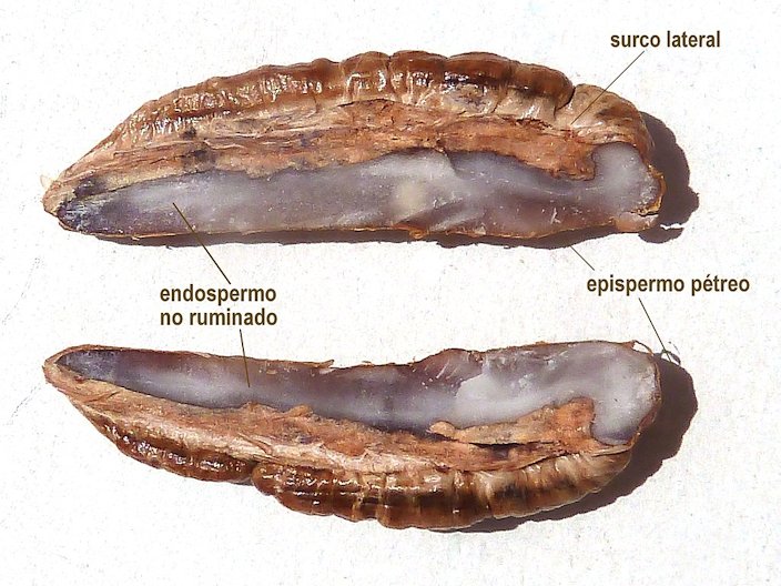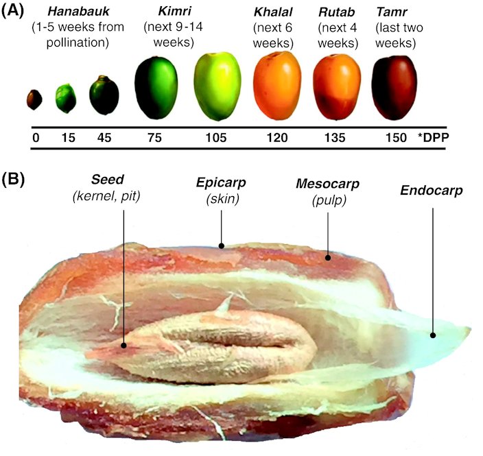 Fig. 22. Unripe fruit Fig. 23. Unripe dates close-up Fig. 24,25. Dates ripening Fig. 26. Dates bought from a street cart in Cairo Fig. 27. Stalks of the date palm after the fruit is plucked from the twigs of branches: note the blend of colours Fig. 28. P. dactylifera seeds Fig. 29. P. dactylifera (palma) - Semilla: corte longitudinal - La Huerta, Albatera, Provincia de Alicante, España Fig. 30. Date palm pit cover (called قِطمِير in Arabic language) Fig. 31. (A) Different fruiting stages of date palm according to DPP (days post-pollination) showing Khalal, Rutab and Tamr, the three edible stages of the fruit (Reprinted from Al-Mssallem et al. by permission from Macmillan Publishers Ltd.: [Nature Communications], copyright (2013)); (B) The anatomy of the date fruit at Tamr stage showing the epicarp, mesocarp, endocarp and seed Varieties There are hundreds of date cultivars, of which only about 60 are widely grown throughout the 15 major date-growing countries. 14 Though no cultivars are well adapted to South Florida, it would be best to choose cultivars reported to be more tolerant of humidity and rain. Julia Morton, in her book Fruits of warm climates, recommends the following: a.) The following cultivars are the most tolerant of humidity and rain: ‘Halaway’, ‘Khadrawy’, and ‘Kaktoom’. b.) The cultivar ‘Medjool’ is intermediate in its tolerance of humidity and rain. c.) The following cultivars are not at all tolerant of humidity and rain, therefore are not good candidates for growing well in South Florida: ‘Zahdi’, ‘Deglet Noor’. It can be noted, unfortunately, that ‘Zahdi’, ‘Deglet Noor,’ and sometimes ‘Medjool’, are the ones most often offered for sale in South Florida. 6
