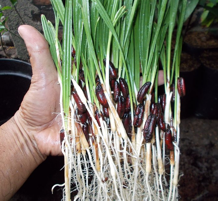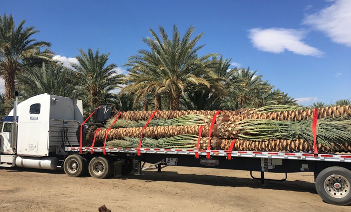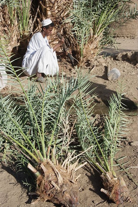 Fig. 35. Germination of date palm Fig. 36. Date palm seedlings in hand Fig. 37. Mansuri cutting offshoots called Shatla (شتلا) from the lower trunk of a parent palm tree in Dar al-Manasir, Northern Sudan Date Palm Propagation, Food and Agricultural Organization of the United Nations Climatic Requirements Date palm is very exacting in its climatic requirement, which according to an Arab saying should grow with its feet in running water and its head in the fire of the sky. The successful cultivation of date palm requires a long summer with high day as well as night temperature, a mild winter without frost, and absence of rain at the time of flowering and fruit setting with low relative humidity and plenty of sunshine. It is estimated that finest date varieties require 3,300 units of heat (base 10 °C) for full maturity of its berries. 7 Planting Deep, sandy loam soils ideal for maximum water–holding capacity and good drainage are desirable. Date palm can grow in alkaline and saline soils but in such soils its growth and productivity are greatly reduced. The soil profile should be free from stones of calcium carbonate concretions and hard pan at least up to 2 m depth. Date palm tolerate high soil salinity (pH 8-10). It can survive in soils having 4 % salt concentration, provided the root system does not come in contact with a stratum of soil where the sodicity is more than 1%. 7 Its high salt tolerance is largely attributable to its chloride ions exclusion ability during water absorption from saline soils this however reduces growth and results in poor quality fruits. 14 Pruning Some minor upkeep may also be required, and many homeowners trim the lower leaves to discourage a fungus that commonly develops in warmer climates. 2 Phoenix dactylifera which is a multi-stemmed palm (Fig. 38) from which the suckers are usually removed to create single stemmed specimens. Trimmed in this manner the date palm will grow to heights of 100 ft (45.7 m). 7 Fruit Thininng Fruit thinning is necessary to ensure adequate flowering in the following year, to improve fruit quality, prevent delayed ripening and reduce compactness and increase ventilation of the bunches. Thinning can be done manually of by chemical sprays. Manual method is common which involves removal of some bunches or strands from each bunch or shortening the length of strands. The number of fruit that a palm can sustain depends on variety, age, vigour and number of green leaves. Three to four bunches/palm is recommended from fifth year onwards. In India 8-10 bunches are left on each palm. The best results are obtained by removing one third strands from the centre of the bunch. However, in long stranded variety, Deglet Noor, shortening of the strands is also necessary. 7 Fertilizing Potassium Deficiency in Palms, University of Florida pdf Potassium Deficiency of Palms in Hawai'i, University of Hawai'i at Mānoa pdf Magnesium Deficiency in Palms, University of Florida pdf Irrigation Irrigation is very essential in date palm because it is grown in hot and dry, low rainfall areas. Further, the water requirement of date palm is high although it can withstand prolonged droughts. Date palm likes wet feet but is damaged under prolonged stagnation. 7 Pests Unripe fruits are attacked by Coccotrypes daclyliperda which makes them fall prematurely. Ripe fruits are often infested by nitidulids—Carpophilus hemipterus, C. multilatus (C. dimidiatus), Urophorus humeralis, and Heptoncus luteolus, which cause decay. 3 Diseases This species is susceptible to Lethal Yellowing disease and should not be planted where other palms are suffering from this always fatal disease. 1 Lethal yellowing (LY) is a phloem-limited disease caused by a phytoplasma and transmitted by a planthopper. Palms with greater than 25% leaf discoloration or a dead apical meristem (bud) due to LY should be removed. 16 It is also susceptible to Lethal bronzing disease (LB) used to be called Texas Phoenix Palm Decline (TPPD). Lethal bronzing (LB) is caused by a phytoplasma—a type of bacteria that lacks a cell wall and cannot be cultured with artificial media. The LB phytoplasma is similar to but genetically distinct from the phytoplasma that causes lethal yellowing (LY) disease of palms. The LB phytoplasma is limited to the phloem (sap) of the palm and cannot survive outside a plant or insect; therefore, it cannot be mechanically transmitted (e.g., by pruning tools or infected roots touching new roots). Once a palm shows symptoms and tests positive for the LBD phytoplasma, it should be removed immediately. 15 The length of time between infection and symptom development (latent period) appears to be about four to five months. From symptom development to collapse of spear leaf is about two to three months, but this is highly variable. 15 Lethal Yellowing (LY) of Palm, University of Florida pdf Lethal Bronzing Disease (LB), University of Florida pdf Food Uses Dry or soft dates are eaten out-of-hand, or may be seeded and stuffed, or chopped and used in a great variety of ways: on cereal, in pudding, bread, cakes, cookies, ice cream, or candy bars. 3 Fruit is of singular importance, as it is a staple part of the diet of millions of people: sap from tapped inflorescence used to make sugar (non destructive). 11 The seeds are roasted and kernels ground as a coffee substitute. Terminal bud leaves are eaten as a vegetable. 14