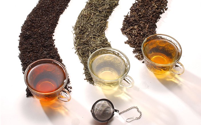Leaves from the plant Camellia sinensis are processed three different ways to produce the three major classes of tea: black (left), green (center), and oolong