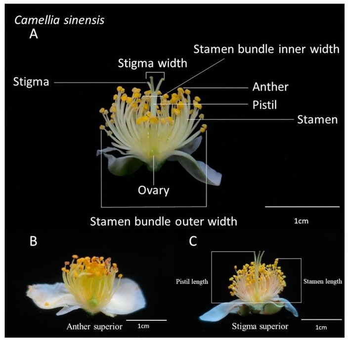 Morphological diagram of the tea (C. sinensis) plant’s floral apparatus. (A) The measured flower organ; (B) the anther superior morphology; and (C) the stigma superior morphology. The positions for measurement of pistil length and stamen length are shown.