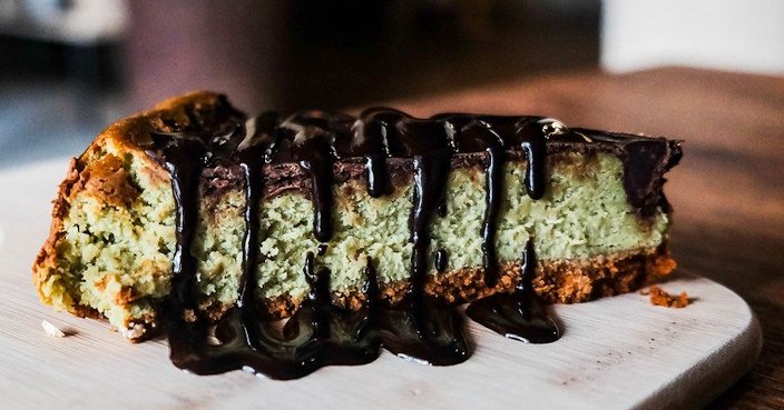 Fig. 51 Verch, Marco. "Matcha cheesecake with chocolate fudge." Wuestenigel, (CC BY 2.0), foto.wuestenigel.com/close-up-of-matcha-cheesecake-with-chocolate-fudge/. Accessed 2 July 2025.