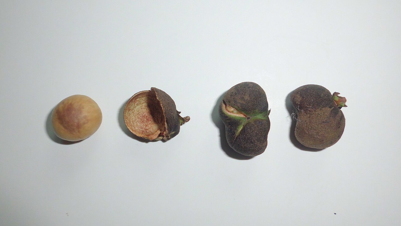 Fig. 20 Keytronicx. "Dried tea fruit, from left to right: tea fruit seed, empty tea fruit hull, slightly cracked tea fruit, and dry intact tea fruit." Wikimedia Commons, 7 Mar. 2024, (CC BY-SA 4.0), Image cropped, commons.wikimedia.org/wiki/File:Tea_fruit_seed.jpg. Accessed 31 Mar. 2025.