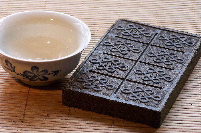 Fig. 31 Voekler, T. "Brick tea - Most tea bricks 'Zhuan Cha’ are from Southern Yunnan in China, and parts of Sichuan Province. Tea bricks are made primarily from the broad leaf 'Dayeh' Camellia Assamica tea plant. Tea leaves have been packed in wooden moulds and pressed into block form." Wikimedia Commons, 27 Oct. 2007, (CC BY SA 3.0),  commons.wikimedia.org/wiki/File:Brick_tea_4897.jpg. Accessed 20 July 2025.